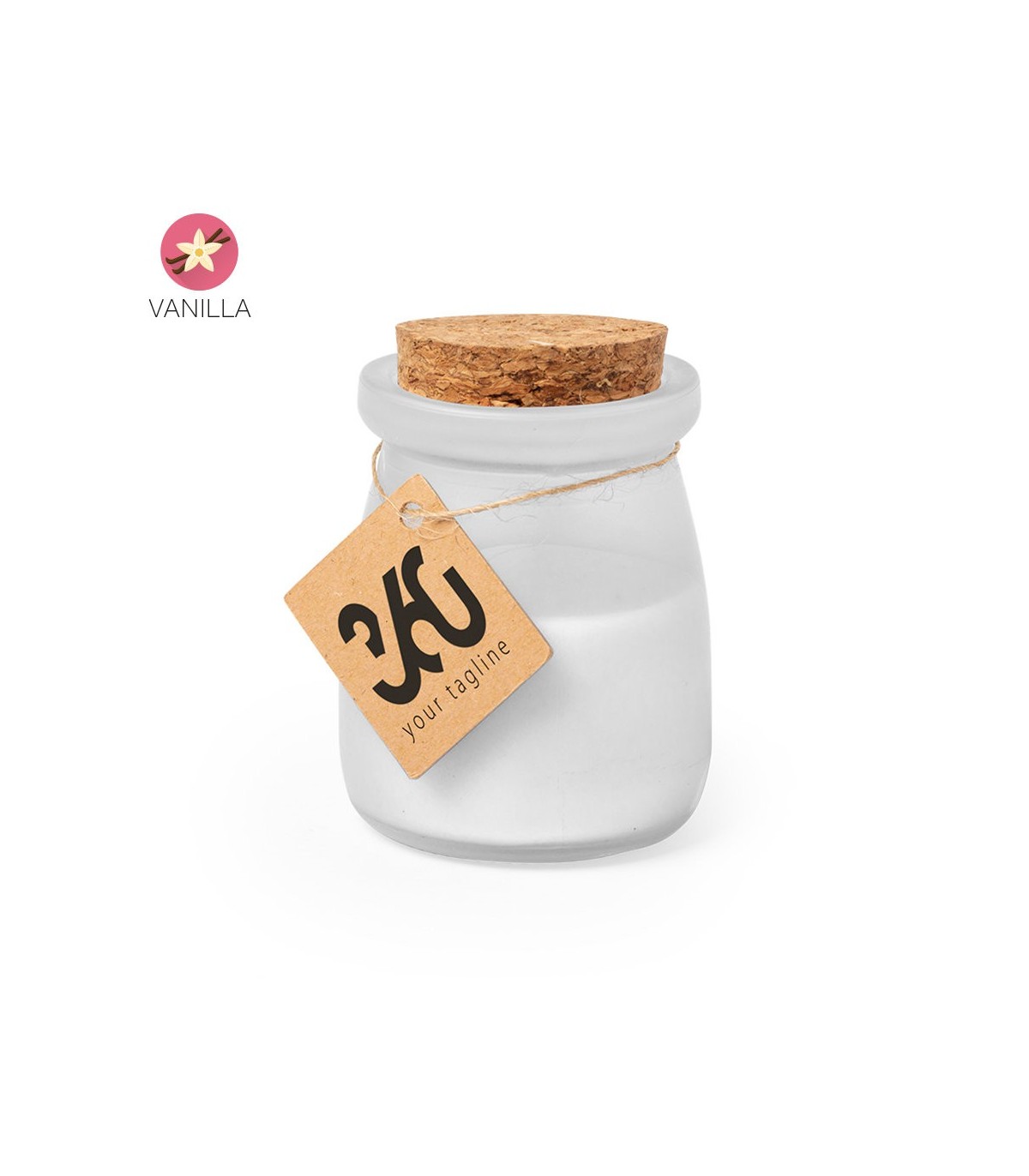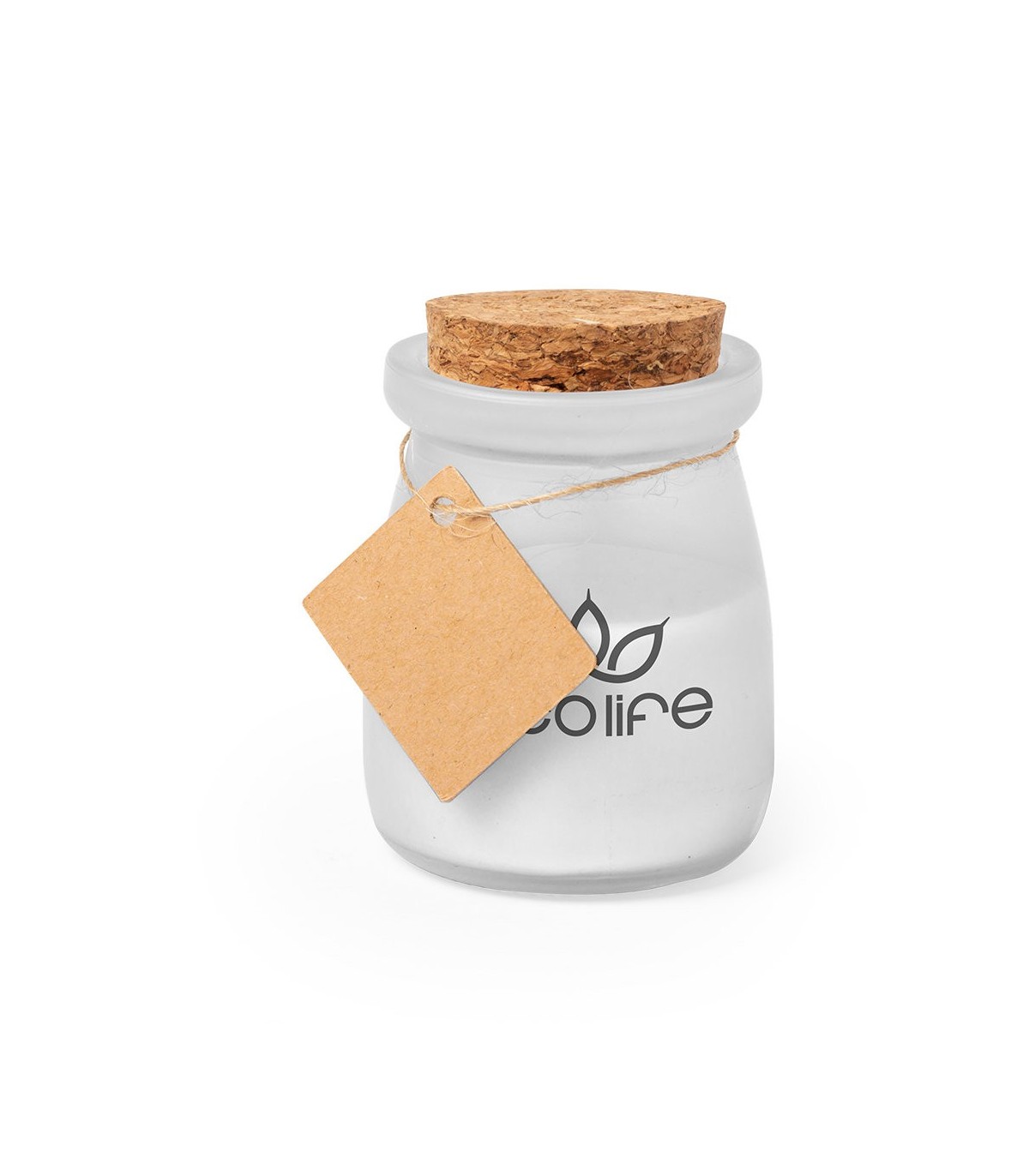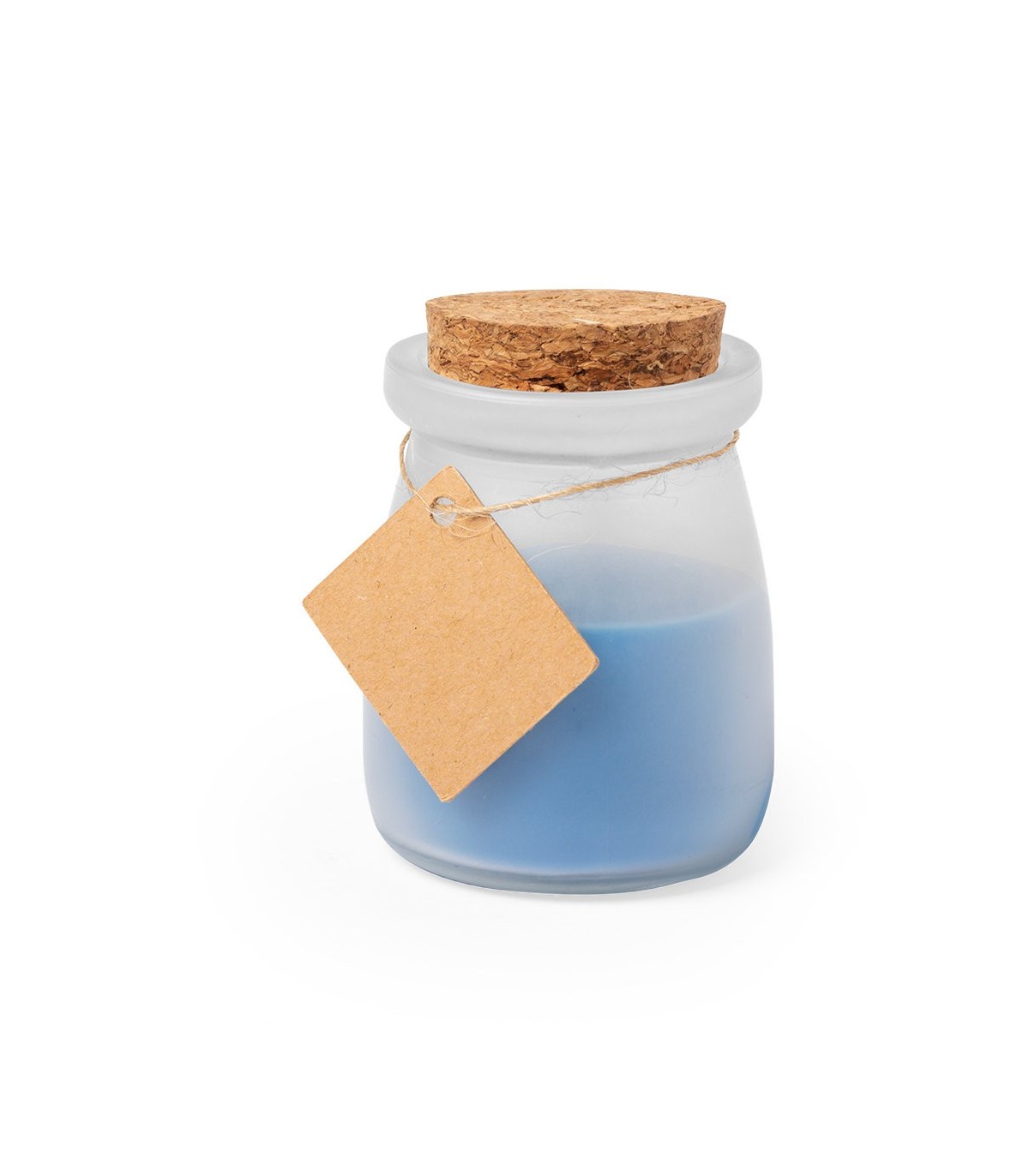Original vela tarrito de cristal. Con tapón de corcho y etiqueta de cartón reciclado con hilo para mensajitos. Disponible en varios colores y presentada en caja blanca individual.