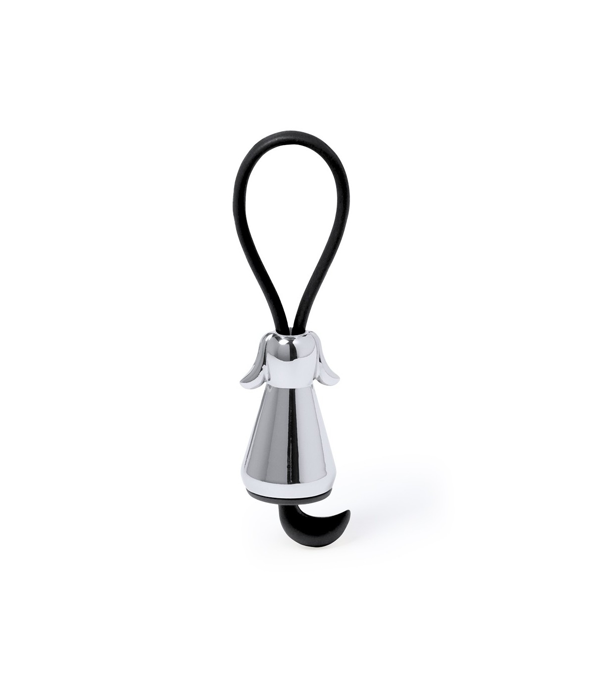 Llaveros minimalistas con forma de perro ideal para regalos de empresa como merchandising promocional, Con cinta en resistente silicona de color negro.