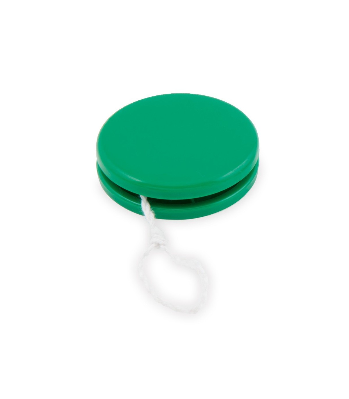 Originales yoyos en poliestireno de colores llamativos para regalos infantiles personalizados, con pita larga de color blanco.